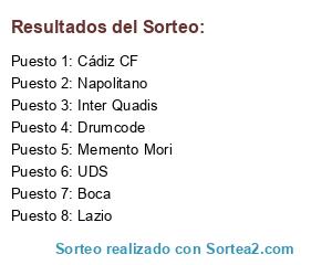 Lista de participantes: Napolitano, UDS, Boca, Lazio, Inter Quadis, Memento Mori, Drumcode, Cádiz CF.
