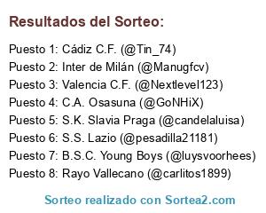 Lista de participantes: Rayo Vallecano (@carlitos1899), B.S.C. Young Boys (@luysvoorhees), S.S. Lazio (@pesadilla21181), S.K. Slavia Praga (@candelaluisa), Cádiz C.F. (@Tin_74), C.A. Osasuna (@GoNHiX), Valencia C.F. (@Nextlevel123), Inter de Milán (@Manugfcv).