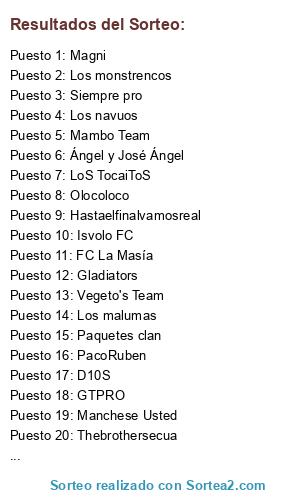 Lista de participantes: Isvolo FC, Invapa, Paquetes clan, Los monstrencos, D10S, Siempre pro, Gladiators, Vegeto's Team, Magni, Los navuos, CaelumPES73, PacoRuben, Los malumas, Thebrothersecua, Mambo Team, LoS TocaiToS, GTPRO, BCN TEAM, FC La Masía, Hastaelfinalvamosreal, Olocoloco, CEDA_ALMENARA, Ángel y José Ángel, Manchese Usted.