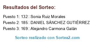 Lista de participantes: 001 Adolfo Espinosa Vázquez, 002 Samuel Cabeza Valero, 003 Teresa Granados, 004 David Garcia Ternero, 005 FRANCISCO JOSÉ LÓPEZ JIMÉNEZ, 006 Pedro Alberto madrid, 007 Álvaro Humberto Jiménez Ferrer, 008 Juan Gerena Millan, 009 Yolanda Ramos Mesa, 010 Jose miguel cazorla duran, 011 Sonia Urbaneja Muñoz, 012 Oliver García madroñal, 013 Francisco Javier Marente Macías, 014 Daniel Palacios chico, 015 Ana Maria Gomez Martínez, 016 Raúl Fajardo Prado, 017 Maria Castilla ortiz, 018 Victoria Martínez Noble, 019 José Miguel García Lluch, 020 Carlos Marín cantón, 021 Diego Sanduvete López, 022 Candela Palacios, 023 JUAN JURADO, 024 Francisco Javier Holgado Cabeza, 025 Jose Luis Gómez Cañete, 026 Antonio M. Moreno Maceda, 027 Florentino Vera Martín, 028 Abel Ángel Gallego de la Rosa, 029 Álvaro Orellana Verdugo, 030 Luis Garrido Gómez, 031 Ángel Hinojosa Hernández, 032 Juan Ramos Rojas, 033 Raúl cornejo Hurtado, 034 Antonio José roldan Gómez, 035 Jesús Baena Arroyo, 036 RAMON ALCALA BARBERA, 037 María Jose García Vargas, 038 Jonatan Falcón Ruiz, 039 Inma aragon Bustillo, 040 Luis Benitez martin, 041 Támara Saavedra Perales, 042 Fernando Acedo del Olmo García, 043 Frank Warwick, 044 Juan Bautista Salado Escaño, 045 Clara Rodriguez, 046 Francisco Javier Crespillo hurtado, 047 Juan Carlos Velázquez Villanueva, 048 Emilio Ruiz García, 049 Paco Ponce, 050 Cristian Gil Nuñez, 051 Ricardo García Oliva, 052 Susana Roldán Ortiz, 053 David Rodríguez Conejo, 054 Max Freemantle, 055 Ángel Sánchez, 056 Elena Novo Godoy, 057 Ignacio Rodríguez Aguilar, 058 Francisco Javier de León Moreno, 059 Antonio Rivera García, 060 Daniel Márquez, 061 Noelia Castillo valle, 062 Adolfo Maí Ponce de León, 063 José estrada canto, 064 Maximiliano clares martinez, 065 Juan de Dios Medina García, 066 Benito Pérez Monge, 067 Tomás Valencia Álvarez, 068 Victor Rubio Rodriguez, 069 Andrea Copano Rojas, 070 Adrian piedra Fernández, 071 Francisco Maldonado Camacho, 072 Miguel lobato parra, 073 Pedro García Conde, 074 Ana María Delgado Panal, 075 Juan Luis García Alonso, 076 Luis Miguel Matos Barroso, 077 Juan Gabriel rivera Jiménez, 078 Gonzalo Torres Reyes, 079 Jonatan Rivas Busto, 080 Francisco Javier ramirez salas, 081 Javier García Pérez, 082 Antonio José Jaén García, 083 María del Carmen Santos Ruiz, 084 Elías Troso Tondela, 085 Curro Carmona Gómez, 086 Jose miguel gomez, 087 Penélope Márquez Romero, 088 Israel Moreno Medina, 089 Carmen Fernández Márquez, 090 Andres Benot Rodriguez, 091 Beatriz Ramírez Leal, 092 Jesús Torres Huete, 093 Jose Florido Lopes, 094 María Isabel Fernández Sánchez, 095 Lorenzo Neira Beltrán, 096 Maria marchante barrera, 097 Ángel Ortiz Castaño, 098 Luis Muñoz Gomar, 099 Francisco Expósito Amado, 100 Javier Bermudez, 101 Francisco Javier Sánchez Martínez, 102 Francisco Luna Síles, 103 Tania Cano Gil, 104 Manuel Roldán Gonzalez, 105 Daniel Espinar Granado, 106 Noemí César Pérez, 107 SONIA MUÑOZ GARCIA, 108 Carmelo García Senechal, 109 Elena Barroso Sanchez, 110 Ramón García Portillo, 111 Mercedes Marrufo Pruaño, 112 Juan Carlos Amaya, 113 Manuel Jesús Sánchez Cortabarra, 114 Francisco Carretero Calderón, 115 Esteban Amaya Cortés, 116 Jose david mejias mateos, 117 Cristóbal Benítez Crespo, 118 Isidro pastor perez, 119 Eduardo Rubén Puertas Domínguez, 120 Antonio Jesús Martínez Foncubierta, 121 Miguel Ángel Lara Luque, 122 Joaquín Hurtado Suárez, 123 Juan García Saravia, 124 Gaspar saborido Martínez, 125 Manuel Grimaldi Pérez, 126 Julio Antonio Moreno Cubero, 127 Jorge Sánchez Sánchez, 128 Raúl Castillo Zaldivar, 129 Rocío Delgado Panal, 130 Eduardo Rivera Morejon, 131 Jonás Jonnatan Andreu Pérez, 132 Sonia Ruiz Morales, 133 Alejandro Luque Balmaseda, 134 Alejandro Niembro Hernández, 135 Blas arrocha escalona, 136 Manuel José López Rodríguez, 137 Francisco mata López, 138 José Luis Ortega Seijo, 139 Salvador Alcazar Galvan, 140 Francisco Vargas Guerrero, 141 Jesús Bravo Vila, 142 Jesús Manuel García Montaño, 143 Manuel Ángel Moreno Dávila, 144 Enrique Buiza Guerrero, 145 Maria del mar Valentín Santos, 146 Ramon lopez lobato, 147 José Manuel Pernia sosa, 148 José Manuel López Ruiz, 149 Juan Manuel Prieto Ortega, 150 Luisa Maria Sanchez Collada, 151 Salvador Guirado Apresa, 152 Sergio Alba Huescar, 153 José Luis Jiménez Hellín, 154 Victoria maria Sánchez Martínez, 155 Olga Sánchez rueda, 156 Luis Miguel Hernández Sánchez, 157 Fidel Hijano Muñoz, 158 Francisco Alberto Crespo Muñoz, 159 María José Álvarez fernandez, 160 Virginia callealta Grimaldi, 161 María Dolores Bornes Cala, 162 Juan Valenzuela Chica, 163 Manuel Vela Romero, 164 Isabel María Rosado Rodríguez, 165 José Manuel Garzón Bellido, 166 Cristina Pradas Barea, 167 Diego Arenas Arenas, 168 Iván Rosillo Raposo, 169 Alejandro Carmona Galán, 170 Fco Javier Pérez Ferrete, 171 Alejandro Hernández Muriel, 172 Andrés Delgado Camacho, 173 Andres Jiménez ordoñez, 174 Julia López Camacho, 175 Jose Antonio Álvarez Figueroa, 176 Francisco Segarra Corzo, 177 Jose Manuel Peinado Cebada, 178 Antonio Ocaña Redondo, 179 Margaritas Romero Martin, 180 Victor Garcia Iglesia, 181 Ana María García Pinos, 182 Victor Manuel Mayorga Rapodo, 183 Pablo Clemente carmona, 184 José Sebastián Luque Camero, 185 DANIEL SÁNCHEZ GUTIÉRREZ, 186 Sonia fierro soto, 187 David Márquez Fernández, 188 Yolanda Macías trujillo, 189 Julio José Gamero Lopera, 190 Leire Lecanda Lerchundi, 191 Jose Maldonado Ferreira, 192 Antonio Fernández Girón, 193 Raúl Jiménez Díaz, 194 Celia Lamela, 195 José Antonio Arjona Cerrillo, 196 José Tomás Nadales Chacón, 197 Javier Forne Márquez, 198 Vergara Cañizares, 199 Carmen ruiz alonso, 200 Encarni Atienza Morales, 201 Carolina Castro Domínguez, 202 Manuel Martin, 203 Jose Romero Rodríguez, 204 ALEJANDRO JIMENEZ INFANTE, 205 VERONICA CALATAYUD NAVARRO, 206 José L