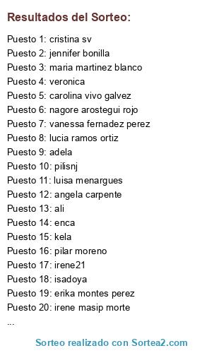 Lista de participantes: acebeR, kelika, montse fernandez, maribeco cp, nagore arostegui rojo, isadoya, mia artesa, vanessa fernadez perez, alberto ocon gonzalez (2 participaciones), maria eugenia, cristina sv, jennifer bonilla, ana, beatriz, enca, Rmaria camacho, anna GS, irene masip morte, Yliana gomez diaz, maria ortega gomez ( 2 ), concepcion matias simarro, erika montes perez, luisa menargues, pilisnj, carolina vivo galvez (2 participaciones), irene21, angela carpente (2 participaciones), kela, domingo carrique belmonte, lucia ramos ortiz, maria martinez blanco, zulema, nerea gonzalez, azu cigales, pilar moreno, veronica, jymas86, adela, ali.