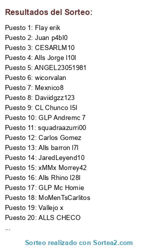 Lista de participantes: Vallejo x, Carlos Gomez, Chuy Rys, Davirus7, xMMx Morrey42, GLP Andremc 7, Oscar santos90, Juan p4bl0, wicorvalan, Flay erik, OverdoneGoose, Alls barron l7l, K1ng de Reyes, CL Chunco I5I, EL TIGERR, Daviidgzz123, CESARLM10, MoMenTsCarlitos, Alls Jorge l10l, Pinagol, Betosr4, Mexnico8, Minors360, ALLS CHECO, squadraazurri00, JaredLeyend10, Alls Rhino l28l, CL Borreman4, ANGEL23051981, ANONYMOUS k07, THE GYB MASTER, GLP Mc Homie.