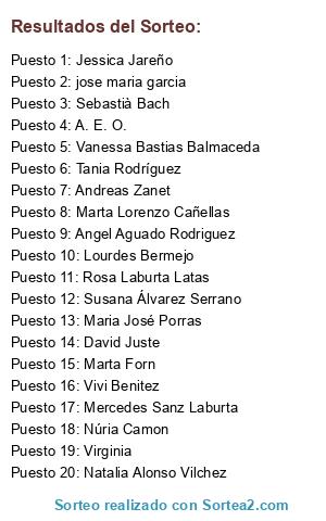 Lista de participantes: Silvia Castro, Antonia Alcalde, Susana Álvarez Serrano, Ismael Sopena, Monica Gimenez, Jose Plans Boix, Sandra Garcia Marín, A. E. O., Gara Meré Espino, Mónica Marin, Maria Queralt Espuga, Vanessa Bastias Balmaceda, Jessica Jareño, Marta Lorenzo Cañellas, Eva Gracia, David Juste, David Herrero Viladot, María Arias, Luis Fernando Trepat, Nuria Añón Rodríguez, Sonia S C, Daniel Mensajes, Ester M, Marta Maturana, Esther Toran Puig, Carmen Esther Aceituno cano, Alba Duque González, Maria José Porras, Laura Matas Ambrona, Esther Nacher Bueno, Virginia, iraida barba, Araceli Vázquez, Nerea Reyes, Angel Aguado Rodriguez, MARGA RODRIGUEZ, jose maria garcia, Julia Alcalde, Vivi Benitez, Juan Carlos, Joaquim Bos, Julie Marie, quim, Saida Balogun, Elena Mª Guijarro Garcia, Ramon Ruidor, Africa Perez Robles, Davinia Torija, Amanda Aquina, Montserrat Hernández García, EVA MARIA LINDO MARTIN, Natalia Alonso Vilchez, Marta Forn, EZEQUIEL CLIMENT NAVARRO, Azucena García Berceruelo, Ingrid Palomar Carballo, Juan Carlos Lillo Martínez, Glòria Sorigué Arnau, marta gallego ripoll, Marcela Espin Lombardo, Esther Aguilar, Carmen Camuñas, Joan Hernández, betlem doval chao, Roxana, Luz Marti, Tania Rodríguez, Mercedes Sanz Laburta, Francisco Ruiz., Montse Cañas, Rosa Lema rodriguez, Guadalupe Morales, Rosa Laburta Latas, Andreas Zanet, Maria Buzon, Sebastià Bach, Lourdes Bermejo, José Maria Gallego Reija, Pau, Núria Camon, Teresa A., Ana Enero, Miguel Angel Ortega, Marina Alonso.