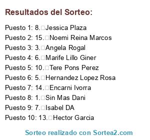 Lista de participantes: 1. Sin Mas Dani, 2. Angelina Rose, 3. Angela Rogal, 4. Tania Amat, 5. Hernandez Lopez Rosa, 6. Marife Lillo Giner , 7. Isabel DA, 8. Jessica Plaza, 9. Soraya Jódar López , 10. Tere Pons Perez, 11. Gele Lillo Giner, 12. Raquel Rodriguez, 13. Hector Garcia, 14. Encarni Ivorra, 15. Noemi Reina Marcos, 16. Carlos Gomis., 17. Ana Rodríguez Pascual, 18. Sara Cano López, 19. Silvia Polo, 20. Pilar Soler , .