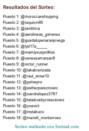 Lista de participantes: @aerolineas_gimenez, @estherperezrivero, @guadalupenaranjovega, @instabuco, @lakabrarizada, @lyd17a_____, @mamiysuspollitos, @manoli_montarroso, @moroccanshopping, @palvepro, @raquicm85, @raul_snow10, @sandralopez3787, @tatalovebycreaciones, @vanessamarsan8, @victor_runner, @yoavict, @zenttrica.