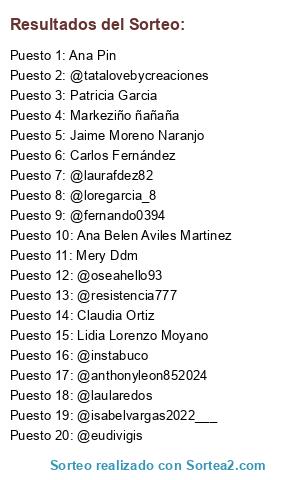 Lista de participantes: Ana Belen Aviles Martinez, Ana Pin, Carlos Fernández, Carlos Rodriguez Jimenez, Claudia Ortiz, Eudivigis SAnchez, Jaime Moreno Naranjo, Jose Antonio Verdugo Gulin, Lidia Lorenzo Moyano, Lore García, Markeziño ñañaña, Mery Ddm, Patricia Garcia, Raquel Conde Martinez, Rima Mencar, @eudivigis, @antoniopica2, @raquicm85, @vikalicius, @anthonyleon852024, @astronomoking, @instabuco, @resistencia777, @lenalioba, @loregarcia_8, @moroccanshopping, @terrakota11, @oseahello93, @isabelvargas2022___, @nuriaalmorox, @steal69, @fernando0394, @laurafdez82, @laularedos, @vanessamarsan8, @tatalovebycreaciones.