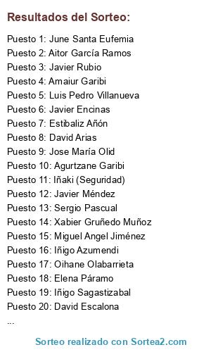 Lista de participantes: Egoitz Ríos Fernández, Raúl Larriba, Patxi Buces, Héctor Fernández Sánchez, Aitor García Ramos, June Santa Eufemia, Jose Ignacio Barrenechea, Javier Encinas, Jose María Olid, Oihane Olabarrieta, Juan Andrés Mesonero, Iñigo Azumendi, Sergio Pascual, Santi Perea, Ricardo Perelló, Luis Pedro Villanueva, Jose Anel Naredo Canga, Francisco José García Fernández, David Escalona, Javier Rubio, Agurtzane Garibi, Javier Méndez, David Arias, Miguel Angel Jiménez, Amaiur Garibi, Estibaliz Añón, Iñaki Campo Sarachaga, Iñaki Gamecho, Iñaki (Seguridad), Iñigo Sagastizabal, Aintzane Esquíbel (Recepción), Xabier Gruñedo Muñoz, Elena Páramo.