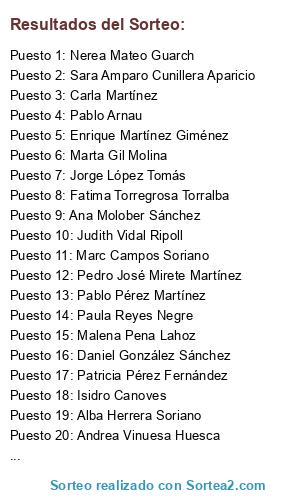 Lista de participantes: Judith Vidal Ripoll, Marta Domínguez López, Alexandra Sempere, Diana Quintana Robles, Irene Peinado Zanon, Blanca García Roig, Sofia López Rius, Laura Ferrer Cruz, Maria Albors Rossi, Sara Amparo Cunillera Aparicio, Pedro José Mirete Martínez, Daniel González Sánchez, Begoña Ruiz Alfonso, Inma Lliso Belda, Gabriela Laliga Blanco, Anna garcia, Amelia Giner Cases, Enrique Martínez Giménez, Anastasiya Bletskan, Marc Campos Soriano, MARÍA JUAN PORTER, Cristina Varjas Martínez, Luis Oca Soto, José Francisco Guzmán Luján, Gaumet Santana Rodríguez, Pablo Arnau, Paula Reyes Negre, Eva Pascual Sánchez, Nerea Mateo Guarch, Lorena Baños Juan, Carla Martínez, Lucía Navarro Sahuquillo, Patricia Pérez Fernández, Isidro Canoves, Claudia García Loscos, Fatima Torregrosa Torralba, evelyn suntaxi, Marina Palomares Alberola, Lucía Sánchez Molina, Sara Villanova Sánchez, Marta García pla, Ana Maria Tudela Prieto, Andrea Vinuesa Huesca, María González Bisquert, Gloria Mañes Rodríguez, Andrea Moreno Pitarch, Malena Pena Lahoz, Eva Muro Díaz, Daniel Benavent Mateu, Jorge López Tomás, Ángela Hernández Isasi, Marta Gil Molina, Alba Herrera Soriano, FERNANDO ALFONSO GARCIA, Ana Molober Sánchez, Pablo Pérez Martínez.