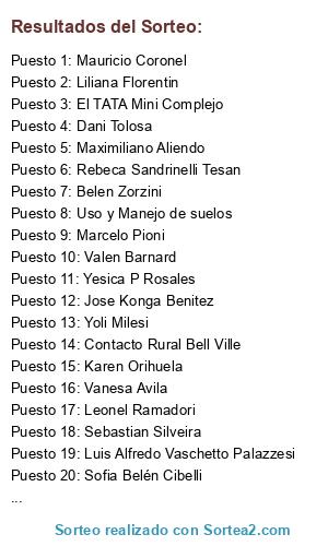 Lista de participantes: Roy Ticona, Karen Orihuela, Desiree Barrera Berte, Belen Zorzini, Mauro Diaz, Valen Barnard, Ana Paula Barruscotto, Sofia Belén Cibelli, Flor Garrone, Lucia Galucci, Soledad Cabrera, Josua Argüello Bergese, Agustin Revol, Paola Noemi Pagani, Dani Tolosa, Rebeca Sandrinelli Tesan, Adriana Sierra, Marcelo Pioni, Claudio Miguel Kvolek, Mauricio Coronel(2 participaciones), Yesica P Rosales, Liliana Florentin, Gustavo Mattalia, Lucian Garcia(2 participaciones), Fran Rojo Amadeo, Leonel Ramadori, Augusto Nicolino, Robertino Mussano, Andreas Gross, Noelia Picatto, Vanesa Avila, Marcelo Fassi, Maximiliano Aliendo, Leo Vaira, Daniela Beseler, Gonzalo Müller, Carlos Nihei, German Sanchez, Luis Alfredo Vaschetto Palazzesi, Exequiel Ibañez Dowling, Noelia Piccatto, Augusto Roberto Chiavassa, Ezequiel Peñaloza, Antonella Molla(2 participaciones), Latino Latinoamerica(2 participaciones), Abel Sebastian Melnik(2 participaciones), Lukitas Rossetto(2 participaciones), Yoli Milesi(2 participaciones), Uso y Manejo de suelos(2 participaciones), El TATA Mini Complejo(2 participaciones), Ignacio Morina(2 participaciones), Jose Konga Benitez(2 participaciones), Sebastian Silveira(2 participaciones), Contacto Rural Bell Ville(2 participaciones), Miguel Alberto Pussetto(2 participaciones).