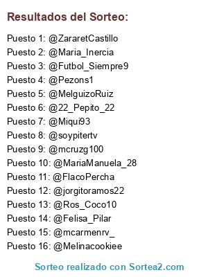 Lista de participantes: @soypitertv, @mcruzg100, @MariaManuela_28, @Futbol_Siempre9, @Melinacookiee, @FlacoPercha, @Felisa_Pilar, @ZararetCastillo, @Pezons1, @MelguizoRuiz, @22_Pepito_22, @jorgitoramos22, @mcarmenrv_, @Ros_Coco10, @Maria_Inercia, @Miqui93.