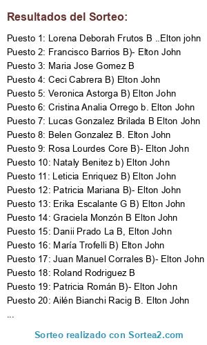 Lista de participantes: Merr Maloriz mercedes maloriz es Elton Joh, Teyha Maidana B)- Elton John, Veronica Campetti B: Elton John, Yohana Micaela Almiron B) Elton John, Bruno Marcelo Di Giuseppe B)- Elton John, Juan Manuel Corrales b. elton john, Graciela Monzón B Elton John, Victor David Quintana Elton John., Rosana Flores Lopéz B)Elthon John., Adrian Aguirre b, Patricia Román B)- Elton John, Nico Ayala B)- Elton John, Leticia Enriquez B) Elton John, Sebas Gamarra B) Elton John, Melli Gonzalez B. Elton Jhon, Ailén Bianchi Racig B. Elton John, Tere Revidatti Elton John, Daniel Medina opción B Elton John, Griselda Mendoza B)_ Elton John, Pedro Walther b, Estela Maria Rios B)Elton John, Lau Zimmerli Luque Jaja la B., Patricia Mariana B)- Elton John, Gerónimo Salinas B- Elton John., Jess Rodriguez B) Elton John, Rosa Lourdes Core B)- Elton John, Miriam Ojeda Elton john, Adrian Benitez Castillo B. Elton john, Karen Pasetto B)- Elton John, David Micelli B - , Belen Gomez B- elton john, Leonardo Fabian Fernandez La respuesta es la B) elton John., Lorena Deborah Frutos B ..Elton john, Anita Barrios Rosales B Elton john, Mariana Morell B) Elton John, Rafael Fernando Andres Corvalan Elton John.-, Alito Silva B) Elton John, Leandro Pacheco B. Elton John, Cristina Analia Orrego b. Elton John, Veronica Romero B. Elton John, Ricardo Antonio Ratti B) Elton John, Clarita Magdalena Alegre B) elton john, Klaudia Aguirre B) Elton John, Erika Escalante G B) Elton John, Veronica Astorga B) Elton John, Victoria Rojas B) Elton John, Claudia Galarza b- Elton John, Mónica Cáceres B) ELTON JOHN, Ceci Cabrera B) Elton John, Soledad Frette B-elton john, Eddy Santiago Gonzalez B) Elton John, Rox Borda B)- Elton John..., Jose Cocherolo B) Elton John, Merr Maloriz no pertenece es Elton Joh, Joaquin Gerónimo Forte B) no pertenece, Lu Zanabria b Elton John, Melii Pomares b- Elton John, Flavia Lagraña Elton john, Arq Noemi Samudio B) Elthon John. no pertenece!, Valeria Penzo Elton john, Flavia Elen Pared b) Elton John, Cuchy Merlo Elton John, German Y. Marty Smieth B Elton John, Maria Marta Alterats B) elton john, Consuelo Mercedes Ortellado B) Elton John, Nataly Benitez b) Elton John , Lucas Gonzalez Brilada B Elton John, Juan Manuel Corrales B)- Elton John, Anita Elorriet B) Elton John ! , Belen Gonzalez B. Elton John, Francisco Barrios B)- Elton John, Martin Masx B) Elton John, Lourdes Lagraña Elton John, Alicia Rohde B) Elthon John, Maru Abreu B)- Elton John, AnaLia Gomez R B ) Elton John, Roland Rodriguez B, Silvana Mucarzel b- elton john, Florencia Salinas B: Elton John., Maar Bazante Carp Elton john, Sandra Beatriz Ojeda La B, Raul Gonzalez La b, Sebastián Raggi B) Elton John, Danii Prado La B, Elton John, Hugo Acevedo B), Lusiana Quin B)- Elton John, Jose Acosta B ,Elton john, Maira Benitez B) Elton John, Gisella Romero B) Elton John, Jani Celeste B)- Elton John, Alberto Gonzalez Por el concurso; Elton John!!, Anibal Quiroz B) Elton John, María Trofelli B) Elton John, Graciela Ramirez B !!!, Maria Jose Gomez B, Flory Turza B) Elton John, Luisina Mathieu Saavedra Elton John. ♫♪, Danilo Andres Medina B) Elton John, Alejandro Gomez B - Elton John, Fernando Castro B)- Elton John.