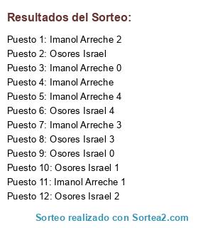Lista de participantes: Osores Israel, Imanol Arreche, Osores Israel 0, Imanol Arreche 0, Osores Israel 1, Imanol Arreche 1, Osores Israel 2, Imanol Arreche 2, Osores Israel 3, Imanol Arreche 3, Osores Israel 4, Imanol Arreche 4.
