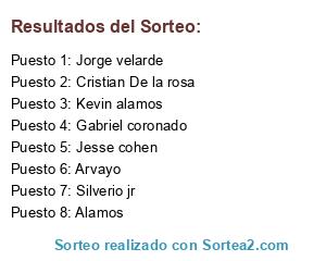 Lista de participantes: Jesse cohen, Arvayo, Alamos, Jorge velarde, Silverio jr, Cristian De la rosa, Kevin alamos, Gabriel coronado.