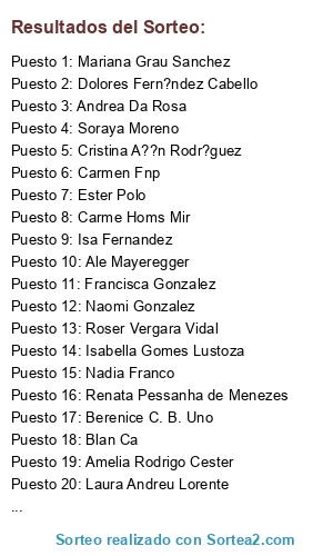 Lista de participantes: Dolores Fern?ndez Cabello, Blan Ca, Guada HT, Amelia Rodrigo Cester, Roser Vergara Vidal, Nathalie Souron Catal?, Renata Pessanha de Menezes, Cristina Montes Alvarez, Laura Andreu Lorente, Olga Porras, Pao Gutierrez, Mariana Grau Sanchez, Isabella Gomes Lustoza, Yolanda Gonzalez Rodriguez, Francisca Gonzalez, Isabela Pinheiro, Carmen Fnp, Maite Fern?ndez, Gina Gon?alves YvesRocher, Andrea Da Rosa, Silvia Juan Ortego, Carme Homs Mir, Ana Pau Vel?zquez, Noelia GF, Naomi Gonzalez, Ester Polo, Soraya Moreno, La Vane, Isa Fernandez, Mireia Oliva Marin, Alba Lucia Yathe Manjarres, Carla Steph, Susana Belen Campos Rodriguez, Nadia Franco, Berenice C. B. Uno, Cristina A??n Rodr?guez, Marta Villanueva, Viviana Fern?ndez Acu?a, Ale Mayeregger, Ester FS, Ver?nica Leticia Campomanes C?ceres, Marta Oliva.