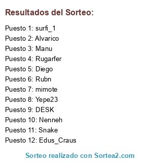 Lista de participantes: Manu, Alvarico, Edus_Craus, mimote, Nenneh, DESK, Snake, Yepe23, Rugarfer, surfi_1, Diego, Rubn.