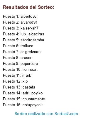 Lista de participantes: peperecre, albertov6, eraser, kaiser-sh7, luix_algeciras, adri_poyiko, mark, er-grekman, sandrosamba, chustamante, estupeyonk, alvarod91, xipi, lionheart, castefa, trollaco.