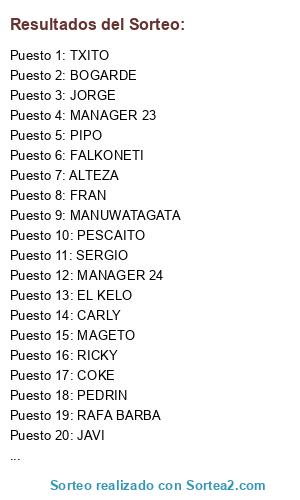 Lista de participantes: SERGIO, MAGETO, TXITO, ER_CHURRITA, ALTEZA, RICKY, TWISTER, MANUWATAGATA, BOGARDE, KELO, RAFA BARBA, JAVI, MIGUECHE, PIPO, JORGE, PEDRIN, PESCA, FALKONETI, ZATOICHI, CARLY, FRAN, COKE, MANAGER 23, MANAGER 24.