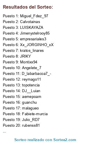 Lista de participantes: jordi25, Cadista_amuerte2, Oladipo097, Juanmiole2016, Kratos_linares, Losadita7, cortex_xx, Yiral87, manuelgarcia1987, Sargoastur, Reymago11, Sandraul_178, ianel79, lexusxxv, Isaakcinho, Jimenystelrooy85, Angel, MARQUEZ-Granada, zatoichi1979, Jose_vallecas19, Davilon82, DaNyLoKo, Carly777, Destructormentes.