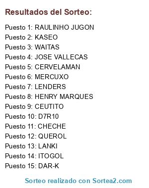 Lista de participantes: CERVELAMAN, CEUTITO, CHECHE, D7R10, DAR-K, HENRY MARQUES, ITOGOL, JOSE VALLECAS, KASEO, LANKI, LENDERS, MERCUXO, QUEROL, RAULINHO JUGON, WAITAS.