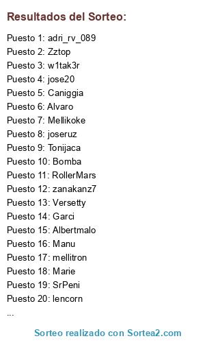 Lista de participantes: Caniggia, joseruz, Alvaro, w1tak3r, Mellikoke, Versetty, Renko, jose20, RollerMars, Frade, frinch, adri_rv_089, Tonijaca, Zztop, Kobe, SrPeni, Fitynho, mellitron, Manu, Garci, Marie, Bomba, Toniha, AllanKidd, Chrislagar, zanakanz7, Albertmalo, lencorn, RESERVA1, RESERVA2.