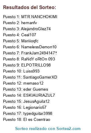 Lista de participantes: NamelessDemon10, Ceal107, AlejandroGlez74, ELPOTRILLO98, RaNdY oRtOn 093, Mariiioqfc, ESKIAURIAZUL7, El es Coentrao, typedguitar3998, JesusAguila12, hernanfv, SantiagoGamerXD, eder Guemes, MTR NANCHOKIMI, Luiss993, FrankJam2494147 , memaso12, Legionario57.