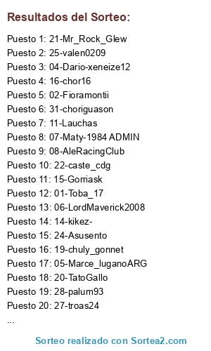 Lista de participantes: 01-Toba_17, 02-Fioramontii, 03-AgustinGuanipa, 04-Dario-xeneize12, 05-Marce_luganoARG, 06-LordMaverick2008, 07-Maty-1984 ADMIN, 08-AleRacingClub, 09-Jovanny981, 10-Pilus23, 11-Lauchas, 12-Nicolpda20, 13-MaxKsE/Maxsoad, 14-kikez-, 15-Gorriask, 16-chor16, 17-lokillo_95, 18-axel_csha, 19-chuly_gonnet, 20-TatoGallo, 21-Mr_Rock_Glew, 22-caste_cdg, 23-Lumax, 24-Asusento, 25-valen0209, 26-fran_casla, 27-troas24, 28-palum93, 29-Diego-492, 30-Fedeto_Rc, 31-choriguason, 32-Sergio1105.