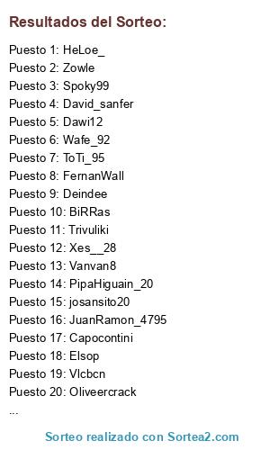 Lista de participantes: TromESP, ercarlos95, Otaku-Girl, Dawi12, Slayer_tris, josansito20, Trivuliki, Suusoo3, Adoxin, Juniorcin, dlapasma, Bisnic86, Nightmare1982, Dihepecrack, ToTi_95, Virus__7, Kaizher3, Tiger_ps3, Sergiito1996, Sonix_ESP, Minaya_, Guidars, Amer4, Capocontini, PipaHiguain_20, Alextonigol, JuanRamon_4795, Skizo-84, Felix_Arg, HeLoe_, FernanWall, Oliveercrack, David_sanfer, Deindee, Vanvan8, Tunoblack, Palio_plata, Zowle, Wafe_92, Alexkiller, MaoshFCB, Victorakovic11, Elsop, Galveniano, XeXiiMaNiiAkoOo_, Lelec, Rubenlg31, Murfeu, Alex_395, Acidcold, Elevation_cdz, BiRRas, Abruzzi81, Aston2, Avealvarez, Xes__28, Spoky99, Ghrt3, Jugador94, Abundi, Polyxz, Vlcbcn, Cule_1992, Mac_cai.