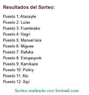 Lista de participantes: Negri, Miguee, Estupeyonk, Rafuka, Kamikaze, Manuel lara, Xipi, Luiso, Poliny, Atacayte, Alu, Fuentesiko.