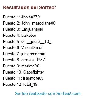 Lista de participantes: erreala_1987, VaronDandi, Caosfighter, letal_19, Emijuansolo, iliasmofe69, bizkotxo, mariete90, John_marcclane00, Jhojan379, del__piero__10_, juniorcodema.