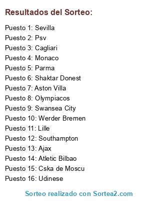 Lista de participantes: Parma, Udinese, Cagliari, Aston Villa, Southampton, Swansea City, Monaco, Lille, Ajax, Psv, Atletic Bilbao, Sevilla, Werder Bremen, Shaktar Donest, Olympiacos, Cska de Moscu.