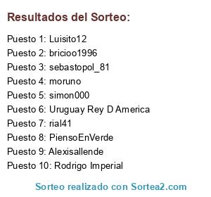 Lista de participantes: Rodrigo Imperial, bricioo1996, sebastopol_81, moruno, rial41, Alexisallende, simon000, PiensoEnVerde, Uruguay Rey D America, Luisito12.