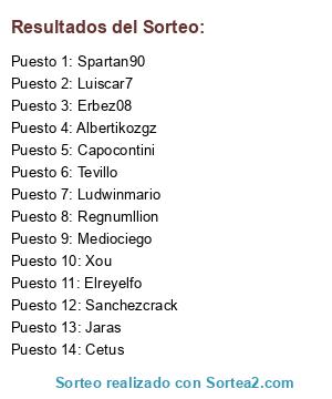 Lista de participantes: Erbez08, Spartan90, Sanchezcrack, Capocontini, Jaras, Tevillo, Albertikozgz, Xou, Mediociego, Ludwinmario, Elreyelfo, Cetus, Luiscar7, Regnumllion.