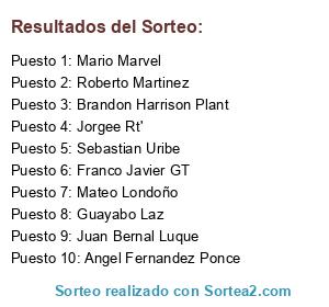 Lista de participantes: Franco Javier GT, Mateo Londoño, Brandon Harrison Plant, Juan Bernal Luque, Jorgee Rt', Sebastian Uribe, Roberto Martinez, Guayabo Laz, Angel Fernandez Ponce, Mario Marvel.