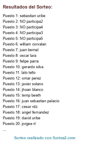 Lista de participantes: THE MISTER HZ, MATEOSTM, CLOTHINGWINGS75, THEANIMAL99, POPEYEDPIT6228, JUANO1016, CAOS XXH3AV3NXX, BORREMAN4, PRUDENTBEE131, CHICHARITO MX, FOREVER TIZ 4, PANICJX, OOSORNIO23, OlREGREZO V2, LEOS96, FZ X LUAAR X, BLUEESCOTT18, EBED2319, SAMUELZATA, RYOX23 HN, no participa1, no participa2, no participa3, no participa4.