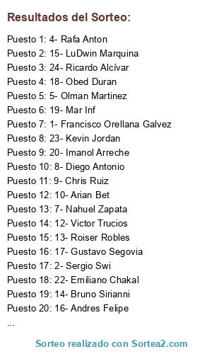 Lista de participantes: 1- Francisco Orellana Galvez, 2- Sergio Swi, 3- Mauro Man, 4- Rafa Anton, 5- Olman Martinez, 6- Wallner Steve, 7- Nahuel Zapata, 8- Diego Antonio, 9- Chris Ruiz, 10- Arian Bet, 11- Osores Israel, 12- Victor Trucios, 13- Roiser Robles, 14- Bruno Sirianni, 15- LuDwin Marquina, 16- Andres Felipe, 17- Gustavo Segovia, 18- Obed Duran, 19- Mar Inf, 20- Imanol Arreche, 21- Jei Sandoval, 22- Emiliano Chakal, 23- Kevin Jordan, 24- Ricardo Alcívar.