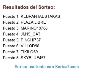 Lista de participantes: VILLOD96, MARINO19788, TIKILO69, JM15_CAT, SKYBLUE457, KEBRANTAESTAKAS, PINCHI737, PLAZA LIBRE.