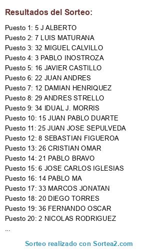 Lista de participantes: 1 FHRANN ALEX, 2 NICOLAS RODRIGUEZ, 3 PABLO INOSTROZA, 4 JUAN PALLERES, 5 J ALBERTO, 6 JOSE CARLOS IGLESIAS, 7 LUIS MATURANA, 8 SEBASTIAN FIGUEROA, 9 FRANCISCO JAVIER, 10 VISCAEL, 11 BRUNO ARIAS, 12 DAMIAN HENRIQUEZ, 13 JUAN DAVID, 14 PABLO MA, 15 JUAN PABLO DUARTE, 16 JAVIER CASTILLO, 17 ISAIAS JMZ, 18 EMANNUEL GONZALEZ, 19 YOHANI ALEXIS, 20 DIEGO TORRES, 21 PABLO BRAVO, 22 JUAN ANDRES, 23 FELIPE PALMA, 24 NICOLAS PLAZA, 25 JUAN JOSE SEPULVEDA, 26 CRISTIAN OMAR, 27 ISAEL CALDERON, 28 LUIS FERNANDO, 29 ANDRES STRELLO, 30 AXEL PORTUGAL, 31 GERARDO FIGUEROA, 32 MIGUEL CALVILLO, 33 MARCOS JONATAN, 34 IDUAL J. MORRIS, 35 JOSE LUIS GARCIA, 36 FERNANDO OSCAR.