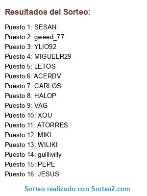 Lista de participantes: gweed_77, gulllivilly, YLIO92, MIGUELR29, WILIKI, LETOS, XOU, VAG, MIKI, PEPE, ACERDV, SESAN, JESUS, HALOP, ATORRES, CARLOS.