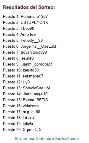 Lista de participantes: Jorgelm7__CaeLuM, vidalsergi, Amortee, Juan_angel10, ESTUPEYONK, Peperecre1987, Fenody__90, migue_86, juanmi_cordobacf, jliy0, SorvoloCaeluM, jesure9, X-peridtj-X, troyanitooo999, luisixu1, zeulito30, enrimabe07, Baena_BETIS, Fbou90, lakylu.