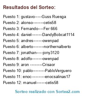 Lista de participantes: alberto--------northernalberto, enoc----------enocsalinas17, manuel-------cetis58, alonso--------cetis58, jonathan-----jony3120, aron ---------Crisaor, andres-------owenpad, pablo---------PabloVerguero, daniel--------DandyBobcat1114, gustavo-----Guss Ruesga, adolfo--------owenpad, Fernando----Fer 666.