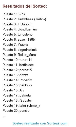 Lista de participantes: sirgodnolimit, coleridge (JMN_N2), I_Dario_I, ponsio, hetfieldcc, iSabato, Roller_Mars, Alv, tungsteno, asanvillauskas, patriota, perik777, spawn1985, drizzt, tururu11, Yraenz, alexdiaz23, diosdfuentes, Phoenix, J-Pik, perea15, Tarbhbass (Tarbh-), lator (uhmo_).