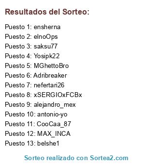 Lista de participantes: MAX_INCA , alejandro_mex , belshe1 , xSERGIOxFCBx , antonio-yo , Yosipk22 , nefertari26 , Adribreaker , ensherna , MGhettoBro , elnoOps , saksu77 , CooCaa_87.
