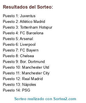 Lista de participantes: FC Bayern, Real Madrid, FC Barcelona, Juventus, Manchester Utd, PSG, Arsenal, Chelsea, Atlético Madrid, Manchester City, Bor. Dortmund, Tottenham Hotspur, Nápoles, Liverpool.