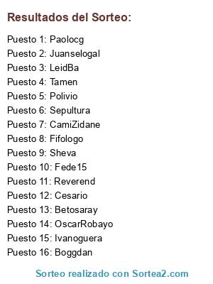 Lista de participantes: Sepultura, Betosaray, Sheva, CamiZidane, Paolocg, Polivio, Boggdan, Ivanoguera, Reverend, OscarRobayo, Fifologo, Juanselogal, Tamen, Cesario, LeidBa, Fede15.