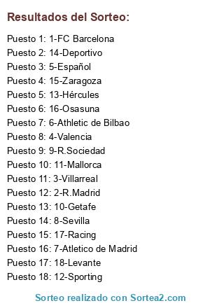 Lista de participantes: 1-FC Barcelona, 2-R.Madrid, 3-Villarreal, 4-Valencia, 5-Español, 6-Athletic de Bilbao, 7-Atletico de Madrid, 8-Sevilla, 9-R.Sociedad, 10-Getafe, 11-Mallorca, 12-Sporting, 13-Hércules, 14-Deportivo, 15-Zaragoza, 16-Osasuna, 17-Racing, 18-Levante.