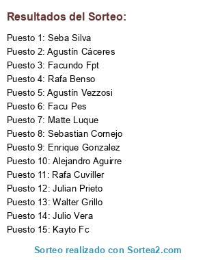 Lista de participantes: Agustín Vezzosi, Alejandro Aguirre, Facundo Fpt, Facu Pes, Matte Luque, Enrique Gonzalez, Agustín Cáceres, Seba Silva, Walter Grillo, Rafa Benso, Rafa Cuviller, Sebastian Cornejo, Kayto Fc, Julio Vera, Julian Prieto.