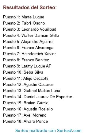 Lista de participantes: Leonardo Vouilloud, Agustin Caceres, Axel Moreno, Matte Luque, Seba Silva, Alejo Ceccotti, Franco Benitez, Fabrii Osorio, Walter Damian Grillo, Franco Alvarenga, Lautty Luque AF, Alvaro Ponce, Braian Garrix, Daniel Juarez De Espeche, Gabriel Matias Luna, Alejandro Aguirre, Heindereich Xavier, Agustin Rosiello.