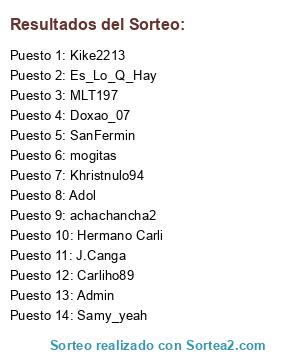 Lista de participantes: achachancha2, Carliho89, Doxao_07, Kike2213, mogitas, Samy_yeah, Admin, Adol, MLT197, Khristnulo94, J.Canga, SanFermin, Es_Lo_Q_Hay, Hermano Carli.