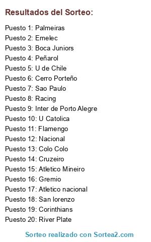 Lista de participantes: San lorenzo, Boca Juniors, River Plate, Racing, Corinthians, Sao Paulo, Palmeiras, Flamengo, Gremio, Cruzeiro, Inter de Porto Alegre, Atletico Mineiro, Colo Colo, U de Chile, U Catolica, Emelec, Nacional, Cerro Porteño, Atletico nacional, Peñarol.