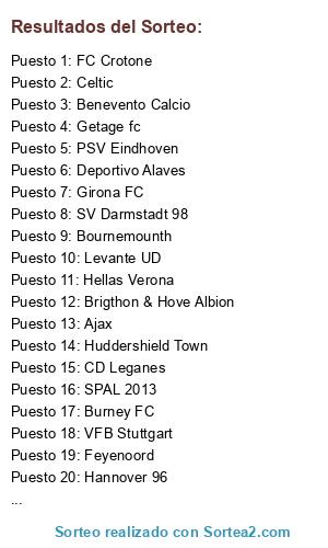 Lista de participantes: Bournemounth, Burney FC, Huddershield Town, Brigthon & Hove Albion, Girona FC, CD Leganes, Getage fc, Deportivo Alaves, Levante UD, SPAL 2013, FC Crotone, Hellas Verona, Benevento Calcio, Hannover 96, VFB Stuttgart, 1FSV Mainz 05, SV Darmstadt 98, PSV Eindhoven, Feyenoord, Ajax, Celtic.